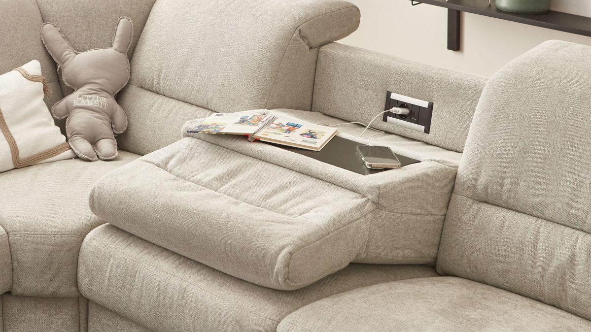 Als zusätzliches Highlight sind in den Rückenteil des Sofas Funktionsbuchsen - genauer gesagt eine Steckdose und ein USB-Anschluss - integriert. Somit können Sie hier auch bequem Ihr Mobiltelefon aufladen oder Ihr Notebook anschließen.