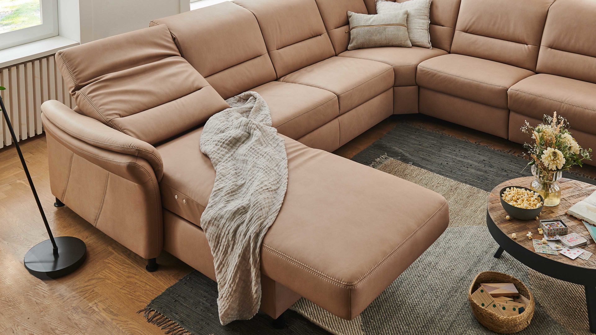 • Die Abbildung zeigt ein Wohnbeispiel, welches auch Dekoration sowie separat erhältliches Zubehör enthält. Im Lieferumfang enthalten ist eine motorische Relaxfunktion ohne Kopfteilverstellung.