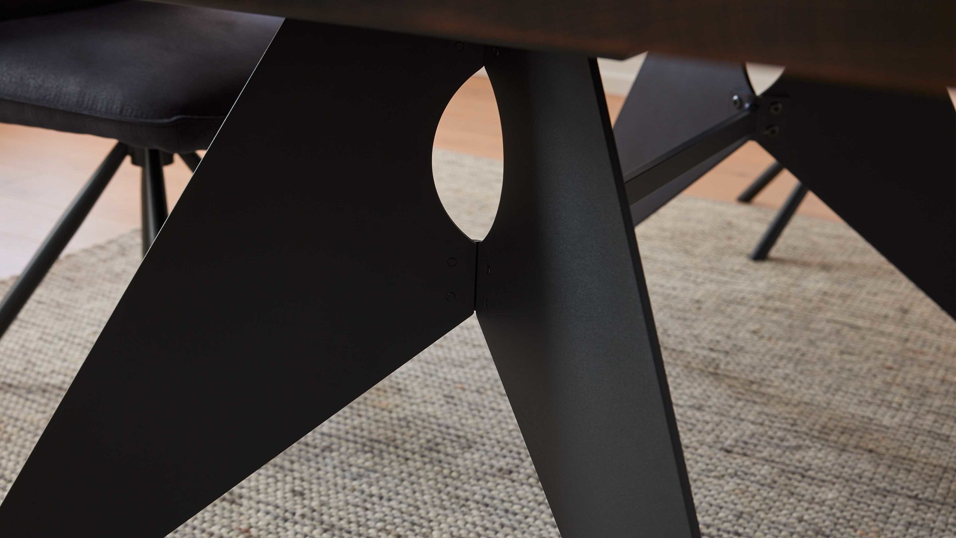 Besonderer Hingucker ist das robuste Gestell aus kreativ geformtem, schwarzem Stahl, das dem Tisch eine architektonisch anmutende Basis verleiht. Die Kombination aus dunkler Eiche und kühlem Metall sorgt für spannende Kontraste und verleiht deinem Wohnbereich einen urbanen Charakter.