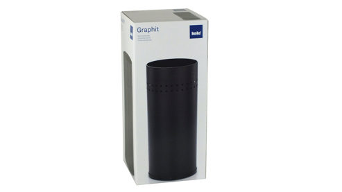 Der schwarze Schirmständer GRAPHIT mit umlaufendem Lochmuster ist aus Metall, die Oberfläche ist matt beschichtet. Die Unterseite ist gummiert. Der Schirmständer hat einen Durchmesser von 21 cm und ist 50 cm hoch.