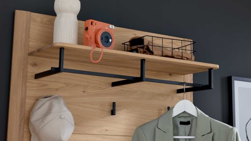 Ausgestattet mit einem Ablageboden, einer daran befestigten Kleiderstange sowie fünf Kleiderhaken, sorgt diese Dielengarderobe für Ordnung und schnellen Zugriff auf häufig genutzte Kleidungsstücke. Dank ihrer kompakten Maße von ca. 90 x 111 x 28 cm (B/LxHxT) lässt sie sich auch in schmalen Fluren problemlos integrieren – ob als Garderobenpaneel, Mantelbrett oder klassische Wandgarderobe.
