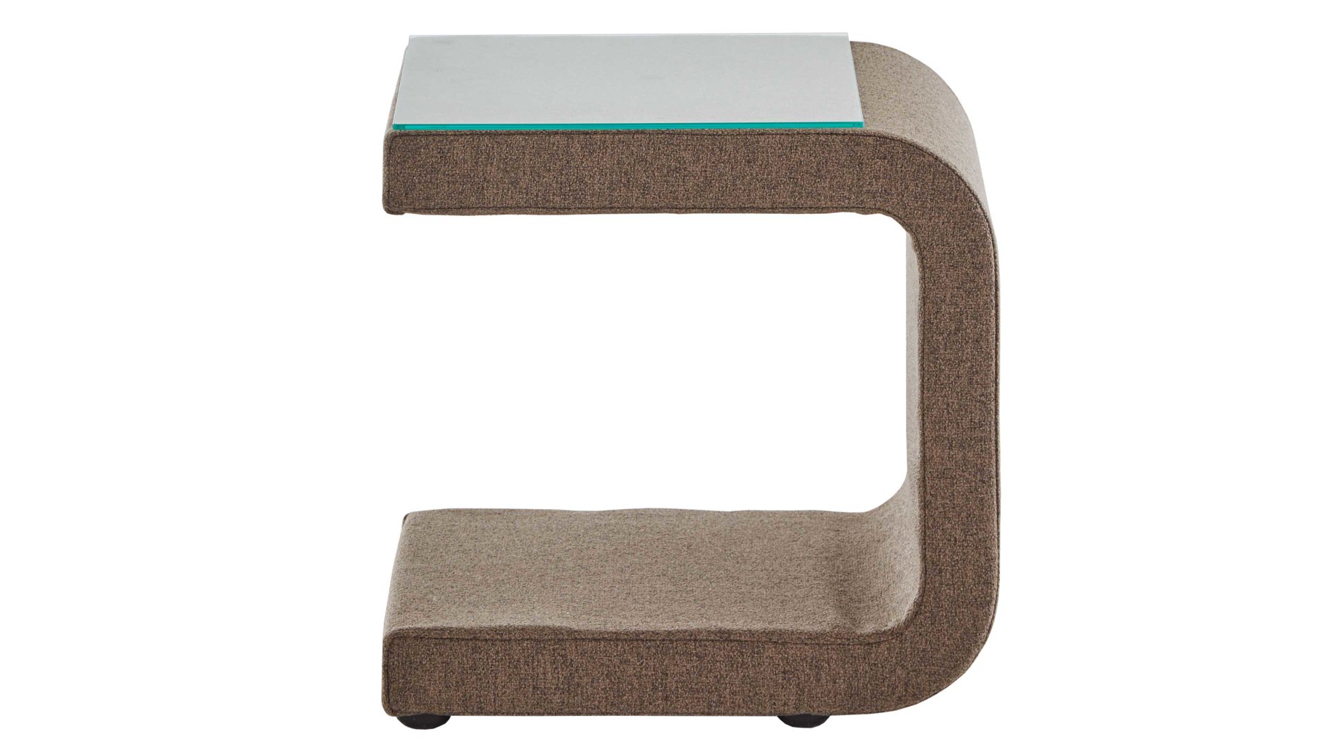 Optional ist ein Glasboden für die Oberseite erhältlich. Die Nachtkonsole La Vita harmoniert exzellent mit dem hellbraun stoffbezogenen Boxspringbett Elaura.