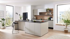 WERT KÜCHE® Mattea - Stilvolle Designküche in Kieselgrau mit warmen Holzakzenten