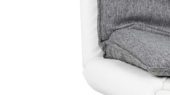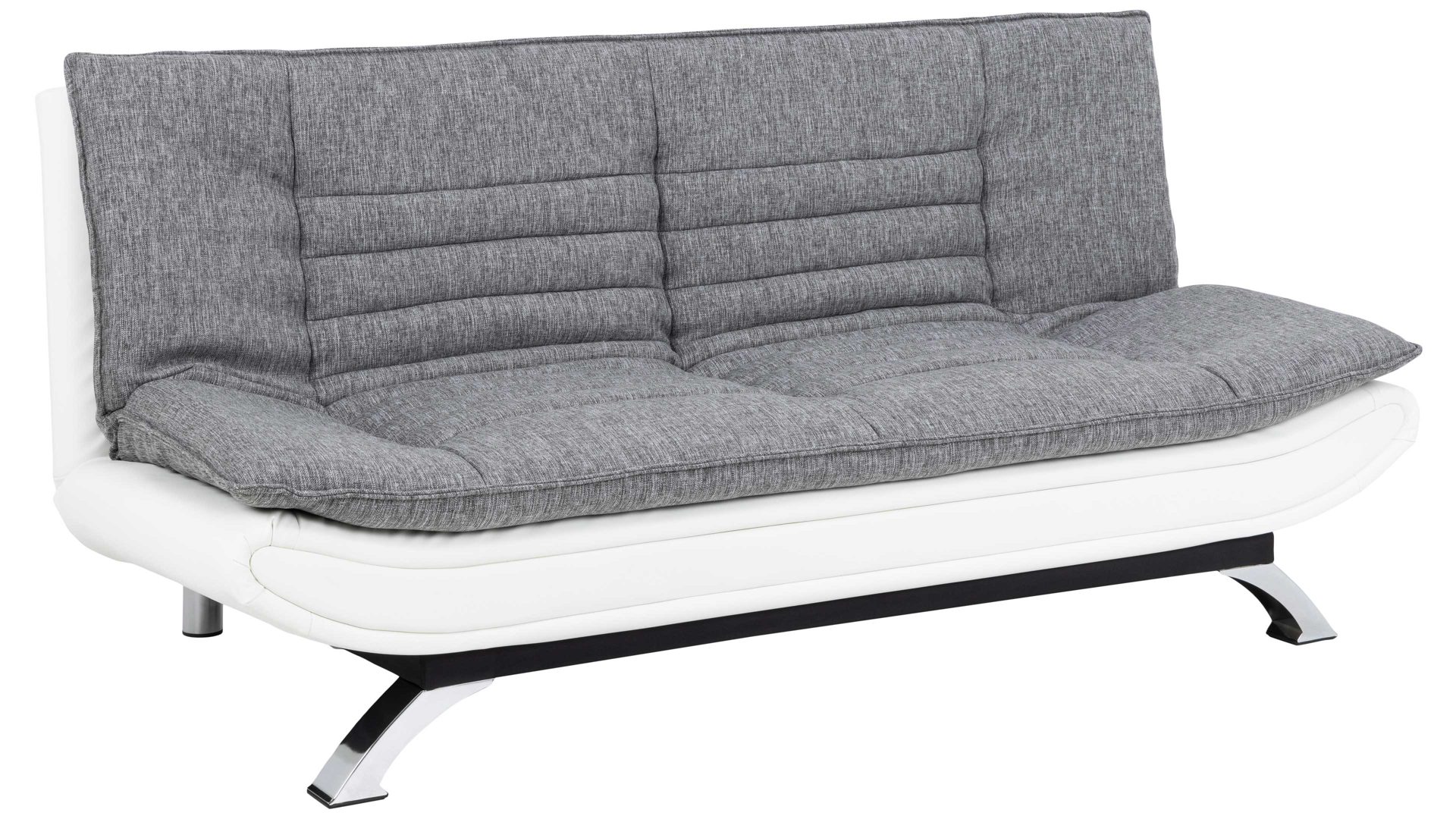 Das Schlafsofa Faith beeindruckt mit seinem modernen, eleganten Design sowie der Funktionalität, die es zu einem vielseitigen Polstermöbel macht. Für die nötige Standstabilität sorgen verchromte Metallfüße. Die Kombination des hellgrauen Stoff- mit dem weißen Kunstlederbezug wirkt besonders edel und fühlt sich angenehm an. Einen gelungenen Akzent setzt die Quersteppung der Sitz- und Rückenfläche. Der Rücken der Couch ist mit schwarzem Nesselstoff bezogen.