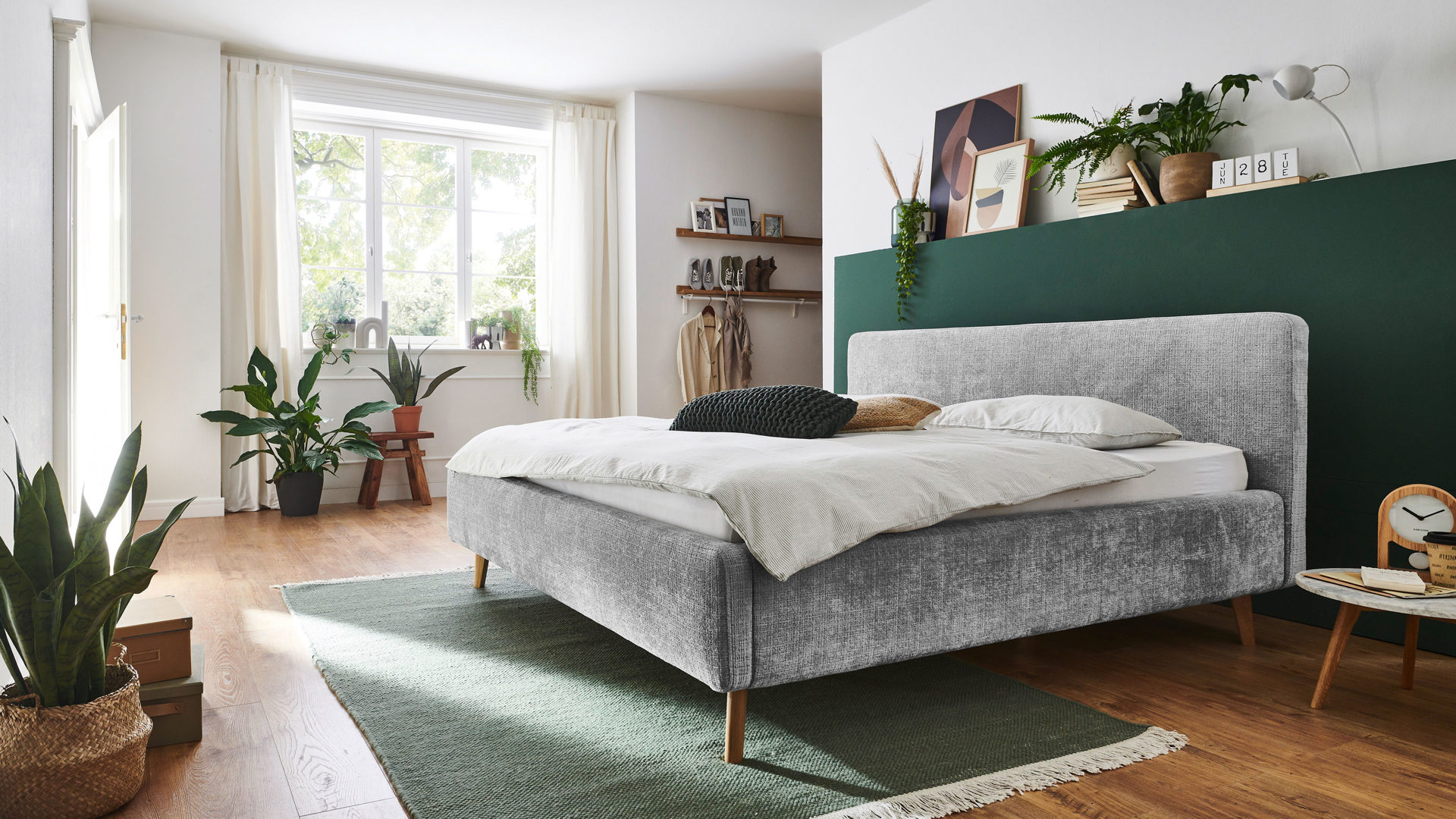 • Die Abbildung zeigt ein Wohnbeispiel. Im Lieferumfang enthalten ist ein Polsterbettgestell mit Kopfteil, wie beschrieben.