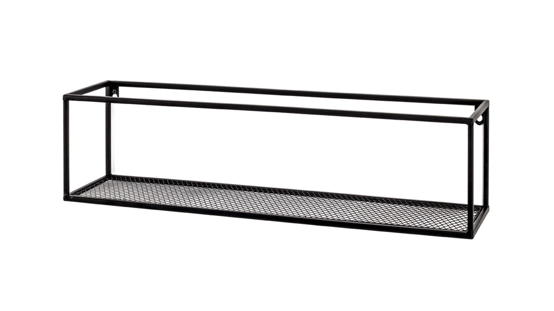 Dieses hochwertige Wandregal repräsentiert die Eleganz schlichter Modernität. Aus einem klassisch mattschwarz lackierten Metallgeflecht und Vierkantrohr-Metallrahmen gefertigt, erscheint es puristisch und ist dazu enorm robust und langlebig. Seine Maße betragen ca. 50 x 16 x 16 cm (LxHxT).
