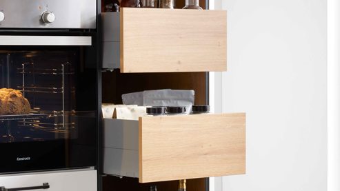 Darüber hinaus ist der hochgebaute Constructa Einbaubackofen CF3M10053 mit fünf Heizarten und Energieeffizienzklasse A (Spektrum A+++ bis D) integriert, wodurch Sie besonders komfortabel und ergonomisch arbeiten können. Ein offenes, holzfarbenes Schubladenregal lockert das Design zusätzlich auf und bietet praktischen Stauraum für häufig genutzte Küchenutensilien.