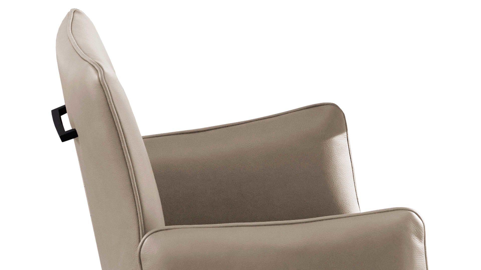 Sitzfläche mit Quadratsteppung, glatt bezogene Rückenlehne mit Metallgriff auf der Rückseite