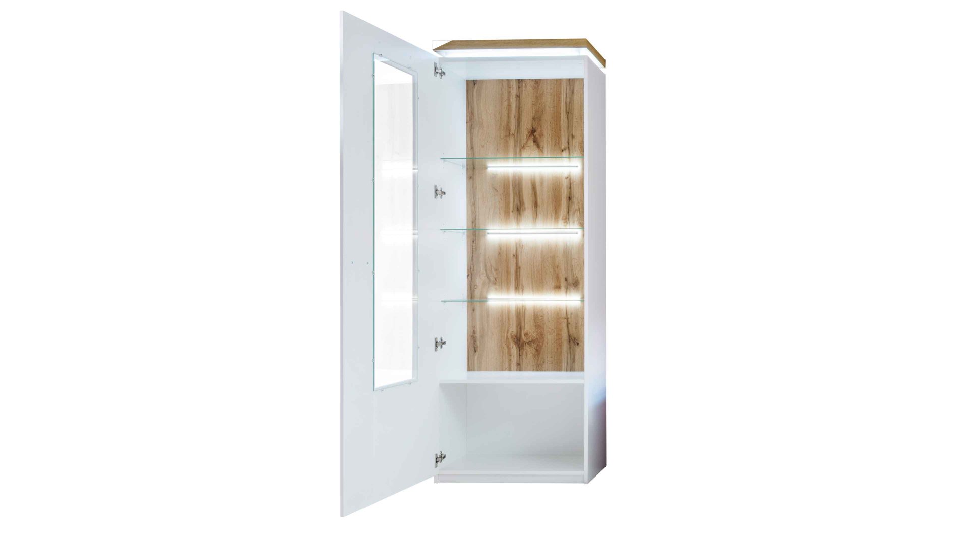 In der eintürigen Vitrine dienen ein Holz- und drei Glasböden als Abstellflächen. Gerade auf den Glasböden, die sich hinter dem Klarglaseinsatz der Tür befinden, kommen schöne Dekorationselemente wunderbar zur Geltung. Die Maße der Standvitrine betragen ca. 70 x 179 x 38 cm (BxHxT).