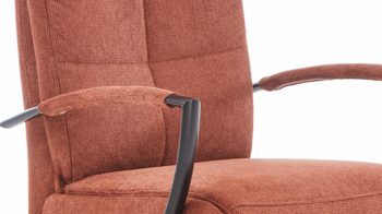 Sein kupferfarbener Flachgewebebezug verleiht dem Sessel eine warme Ausstrahlung im zeitlosen Design. Den Sitz trägt ein mattschwarzer Sternfuß aus Metall. Die ebenfalls mattschwarze Metall-Armlehne bringt eine weich gepolsterte Stoffauflage mit, für noch mehr bequemes Entspannen etwa beim Lesen oder als TV-Sessel zum Fernsehen.