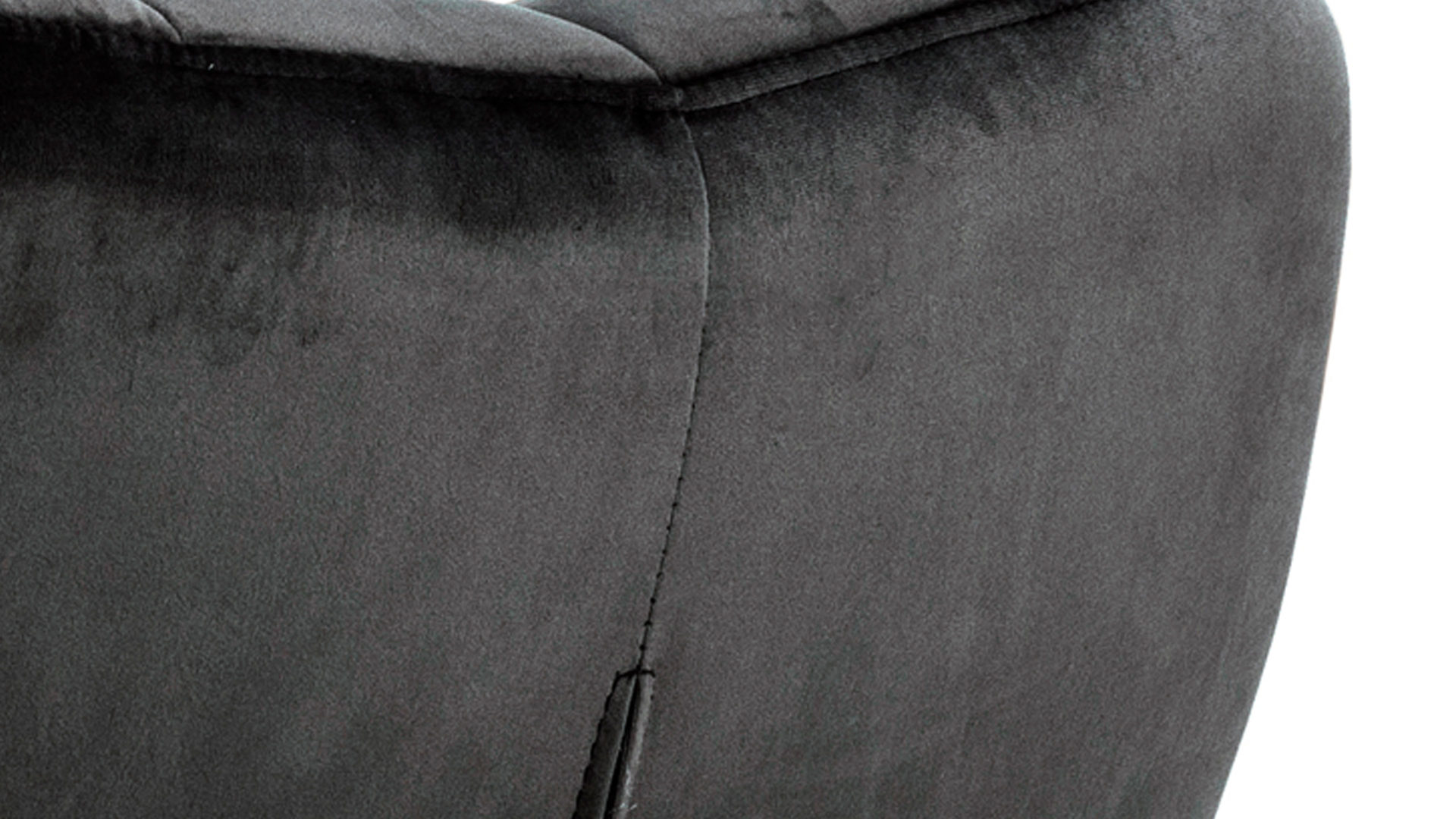 Auch farblich erlaubt der Loungesessel angenehme Freiheit beim Kombinieren: Dafür sorgt der graubraune Samtbezug. Der weiche Stoff umhüllt sowohl die Sitzfläche als auch die gesteppte Rückenlehne inklusive der bequemen Armlehnen herrlich soft. Das rau pulverbeschichtete Metallgestell fließt in sattem Schwarz stimmig in das Gesamtbild ein.