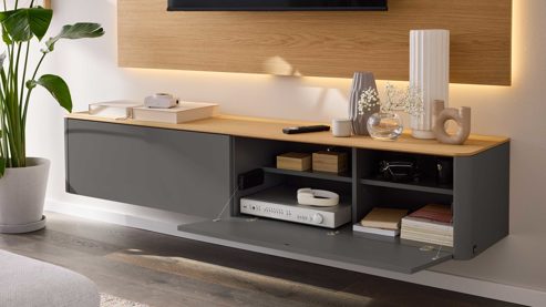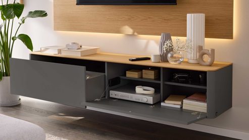 Interliving Wohnzimmer Serie 2035 – TV-Wand in dunkelgrauem Mattlack und hellem Eichefurnier