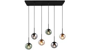 Mit der Hängelampe aus der Interliving Leuchten Serie 9350 bringst du ein echtes Design-Statement in deinen Wohnraum. Sechs organisch geformte, matte Glas-Lampenschirme in den Farbtönen Amber, Grün und Rauch sorgen für ein lebendiges Lichtspiel, während der mattschwarze Metallsockel und die schwarzen Textilkabel der Pendelleuchte einen modernen Look verleihen.