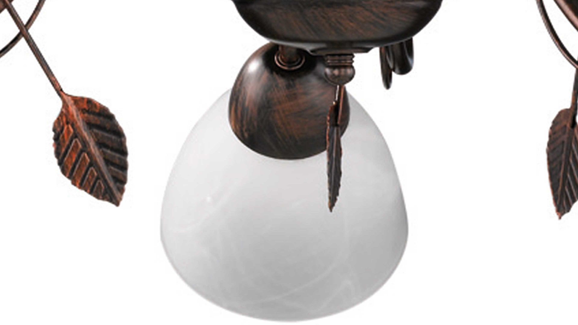 Mit der Kombination aus antik-rostfarbenem Metall und edel-alabasterfarbenen Glas-Lampenschirmen strahlt der Kronleuchter besondere Eleganz aus.