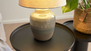 Der beige Stoffschirm auf einem stabilen, weißen Metallgestell sorgt für sanftes, wohnliches Licht. Der Keramikfuß im Farbverlauf Grau, Blau und Taupe begeistert mit einer spannenden Mischung aus glänzenden und matten Oberflächen – ein edles Detail, das deinen Wohnraum aufwertet.