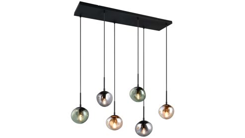 Mit der Hängelampe aus der Interliving Leuchten Serie 9350 bringst du ein echtes Design-Statement in deinen Wohnraum. Sechs organisch geformte, matte Glas-Lampenschirme in den Farbtönen Amber, Grün und Rauch sorgen für ein lebendiges Lichtspiel, während der mattschwarze Metallsockel und die schwarzen Textilkabel der Pendelleuchte einen modernen Look verleihen.