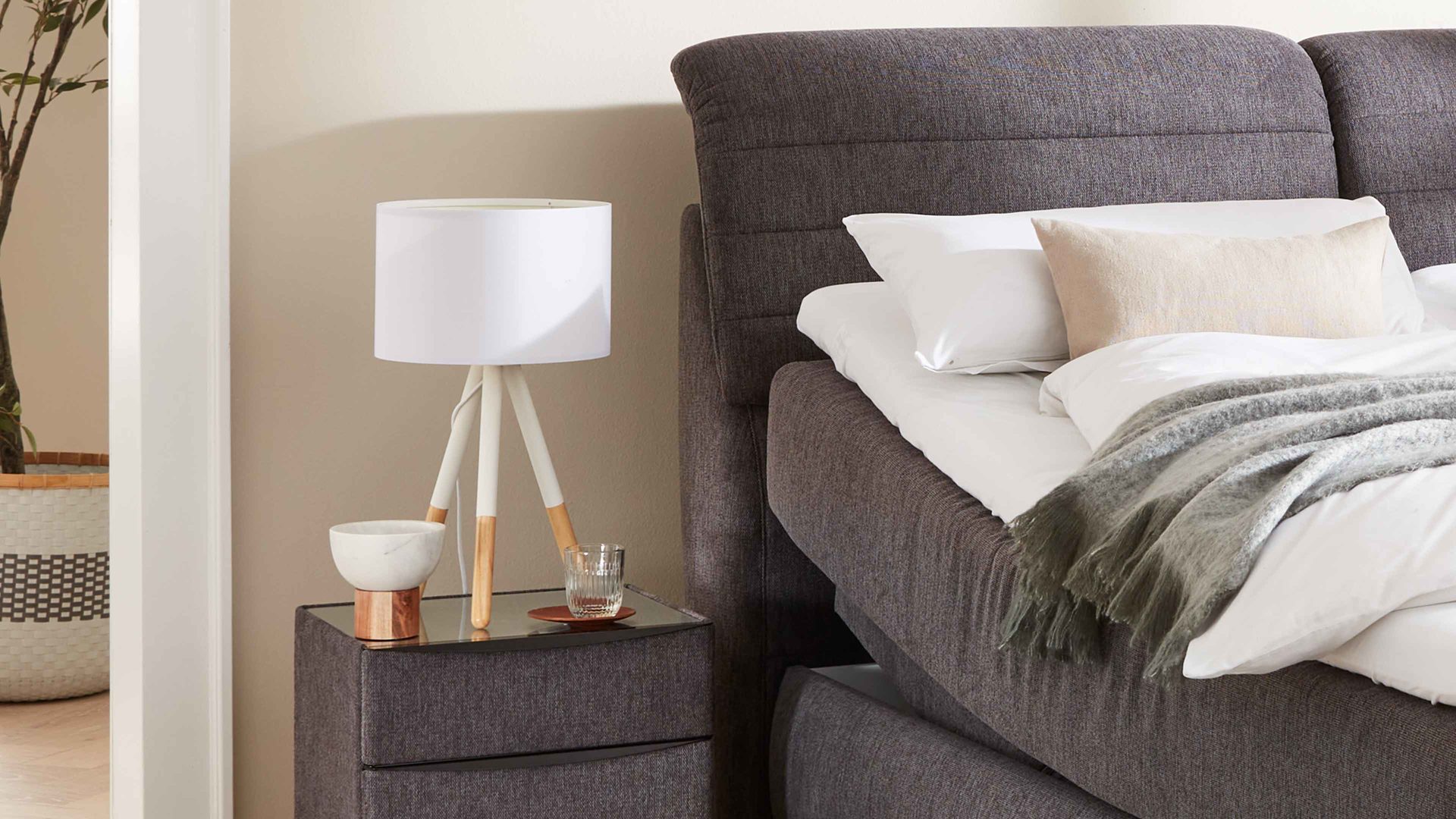 Die Basis bildet der Taschenfederkern-Unterbau mit Motor. Er umfasst zwei rundum stoffbezogene Matratzen in bombierter Optik. Das bedeutet, dass die Bettseiten nach außen gewölbt gepolstert sind. Hinzu kommt eine hochwertige, stabile Multifunktionsplatte mit Motor und Kabel-Fernbedienung im robusten Massivholzrahmen. Kopf- und Fußteil sind separat stufenlos verstellbar. Durch die integrierte CLIMABOX trägt der Unterbau zu einem besseren Schlafklima bei. Die Antirutsch-Einsätze sorgen dafür, dass die Matratzen an Ort und Stelle bleiben.