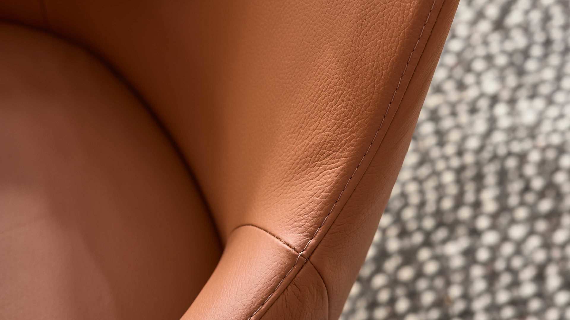 Das konisch geformte Stativgestell aus anthrazitfarben pulverbeschichtetem Metall unterstreicht die moderne Silhouette des Armlehnstuhls und ergänzt den edlen Lederbezug harmonisch. Dank der stabilen Konstruktion und der integrierten, bodenschonenden Kunststoffgleiter steht der Stuhl sicher und schützt empfindliche Untergründe zuverlässig.