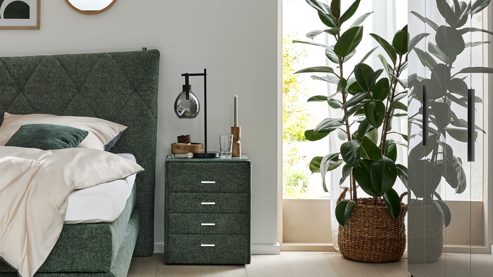 Stilvolle Ordnung in moosgrünem Design mit der Nachtkommode aus der Interliving Bettensystem Serie 1420