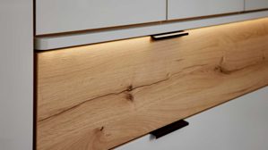 Inklusive Schubkastenbeleuchtungsblende 488 in Champagner mit indirekter LED-Beleuchtung (Fußtrittschalter, Kabellänge ca. 180 cm, fest verbautes LED-Leuchtmittel mit Energieeffizienzklasse F (Spektrum A bis G)) und Passepartoutrahmen 905 in Bianco Eiche Nachbildung.