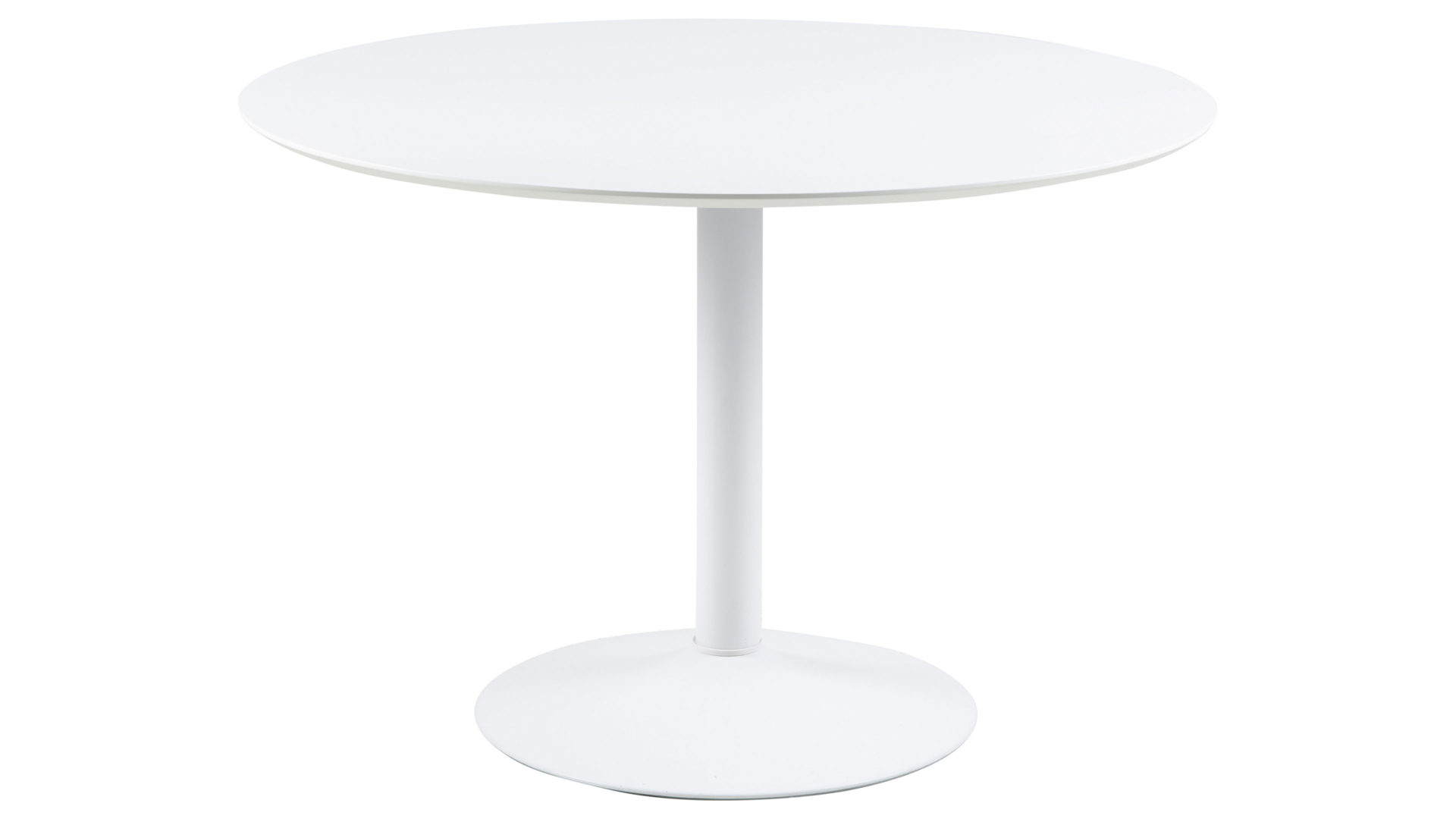 Dieser Esstisch zieht in Ihrer modernen Küche alle Blicke auf sich. Der runde Tisch mit auffälligem Fuß begeistert in strahlendem Weiß und fügt sich damit hervorragend in Ihre Einrichtung ein. Stellen Sie den Esszimmertisch im Retrolook in Ihren Essbereich und freuen Sie sich über die hohe Funktionalität des Esszimmermöbels. Gefertigt aus einer weiß lackierten MDF-Platte und einem Trompetenfuß aus weiß lackiertem Metall begeistert das Esszimmermöbel an geselligen Abenden mit Freunden oder der Familie.