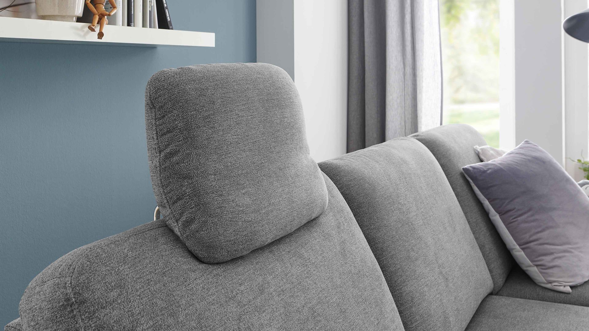 Die Comfort-Kopfstütze CKS ist ein Mehrpreis-Zubehör für die Sofas mit aluminiumfarbenem Mikro-Chenillebezug aus dem Modulmaster Programm MM-ZE1129. Auf der robusten Vorrichtung aus chromfarbenem Metall können Sie das Kopfpolster manuell in der Höhe und Neigung verstellen und die Position stufenlos fixieren. Die bequem gepolsterte Kopfstütze misst ca. 44 x 32 x 10 cm (BxHxT). Es sind drei verschiedene Kopfstützen-Varianten wählbar.