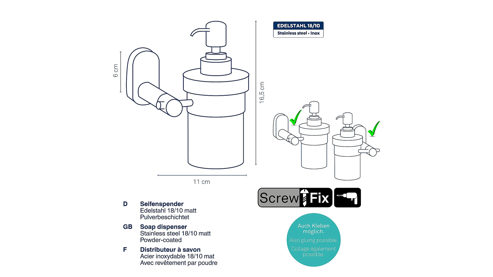 Entdecke unseren eleganten Wandseifenspender Alessio aus Glas für das Badezimmer. Mit einem Fassungsvermögen von 250 ml und einem transparenten Glasbehälter bietet er Funktionalität und Stil. Die matte schwarze Halterung aus Edelstahl verleiht dem Design eine moderne Note. Maße ca. 11 x 17 x 10 cm (BxHxT)