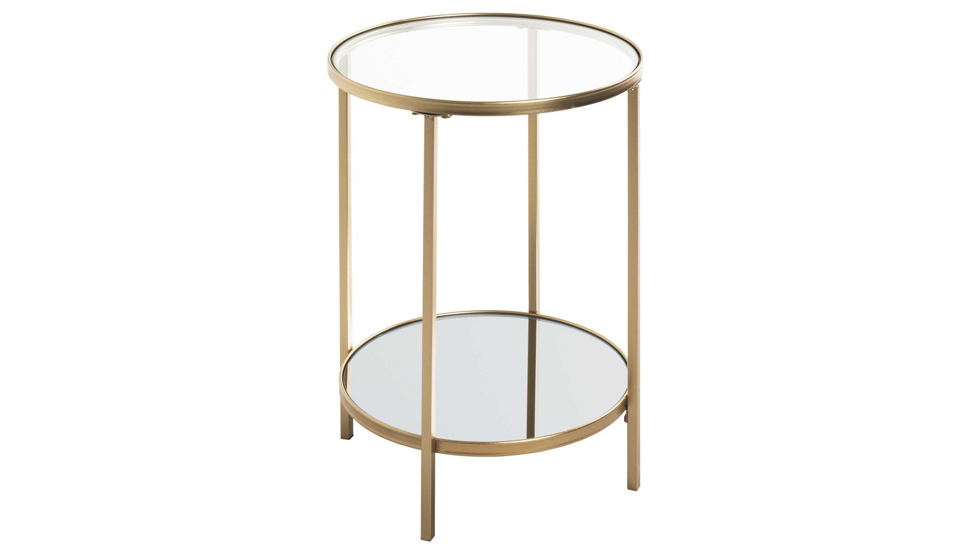 Der Beistelltisch ist mit seinem modernen und eleganten Design ein absoluter Hingucker. Er kombiniert ein goldfarben lackiertes Metallgestell mit zwei Ablagen: Die obere besteht aus Sicherheitsglas und die untere aus Spiegelglas. Dank der hochwertigen Materialien ist das Tischchen robust, widerstandsfähig und langlebig. Seine Maße belaufen sich auf ca. 55 x 39 cm (HxD).