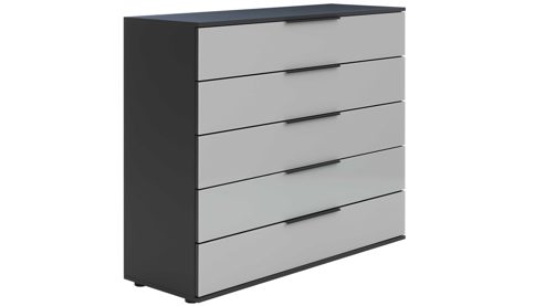 Die Schubladenkommode überzeugt als elegantes Solitärmöbel mit zeitloser Ausstrahlung. Mit seidengrauen Fronten-Glasauflagen, einem basaltfarben lackierten Korpus und anthrazitfarbenen Metallgriffen Basic fügt sie sich harmonisch in moderne Schlafzimmer ein. Ob als Wäschekommode, Schubladenschrank oder dekoratives Wohnmöbel – sie vereint Design und Funktion perfekt.