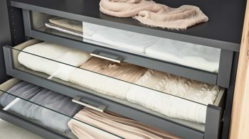 Das Set umfasst drei Schubladen mit edlen Glaseinsätzen. Zudem ist ein Abdeckboden im Lieferumfang enthalten. Die kombinierten Maße der Kleiderschrankschubladen belaufen sich auf ca. 97 x 46 x 56 cm (BxHxT).