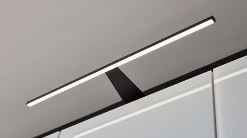 Im Preis enthalten ist das zweiteilige Aufbauleuchten-Set (Typ B20171) – eine perfekte Ergänzung für den Kleiderschrank. Die schwarzen LED-Aufsatzleuchten werden oberhalb montiert und sorgen für eine angenehme, gleichmäßige Ausleuchtung. Jede Leuchte verfügt über ein fest verbautes, nicht dimmbares LED-Leuchtmittel der Energieeffizienzklasse F (Spektrum A bis G) und wird über einen Fußtrittschalter bedient. Maße pro Leuchte: ca. 60 x 19 x 6 cm (B/LxHxT).