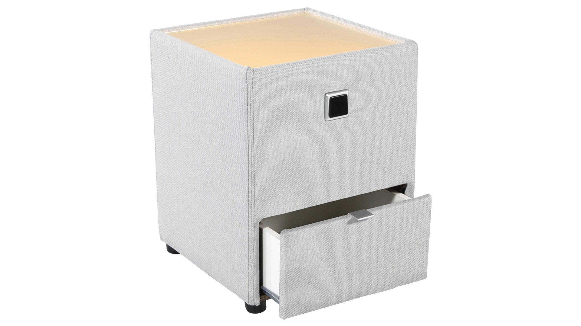 Mit kompakten Maßen von ca. 43 x 53 x 45 cm (BxHxT) passt die Nachtkommode mit indirekter Beleuchtung wunderbar neben Ihr Bett. Die Ablagefläche aus Plexiglas schafft mit dem Stoffbezug einen angesagten Materialmix. Der Nachtschrank kommt inklusive Leuchtmittel zu Ihnen nach Hause, wo Sie Ihn als Lichtquelle direkt neben dem Doppelbett aufstellen.