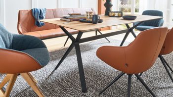 Der Armlehnstuhl Aiko Four A32 ist eine hervorragende Wahl für elegante, natürliche Wohnstile. In Kombination mit einem Massivholztisch entsteht ein warmes, einladendes Ambiente. DEKTON®-Tischplatten in Grautönen oder Steinoptik setzen moderne Kontraste. Ergänzen Sie das Ensemble durch passende Stühle aus der Serie – gerne auch mit Drehfunktion für noch mehr Komfort.