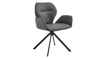 Er kombiniert ein mattschwarz lackiertes Stativgestell aus robustem Eisen mit einem silberfarbenen Mikrofaserbezug in Lederoptik und fügt sich in verschiedene Wohnstile harmonisch ein. Zu den optischen Highlights des Esszimmerstuhls gehört neben der Formensprache und den perfekt aufeinander abgestimmten Farben der markante Quereinzug im Rücken. Praktisch begeistern die Drehbarkeit um 180 Grad mit Rückholfunktion sowie die bodenschonenden Gleiter am Gestell.