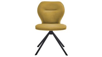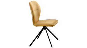 Er kombiniert ein mattschwarz lackiertes Stativgestell aus robustem Eisen mit einem curcumafarbenem Mikrofaserbezug in Lederoptik und fügt sich in verschiedene Wohnstile harmonisch ein. Zu den optischen Highlights des Esszimmerstuhls gehört neben der Formensprache und den perfekt aufeinander abgestimmten Farben der markante Quereinzug im Rücken.