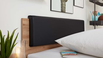 Das Bettgestell 5767 aus der Interliving Jugendzimmer Serie 1701 kombiniert edle Risseiche-Nachbildung mit einem Polsterkopfteil in anthrazitfarbenem Kunstleder.