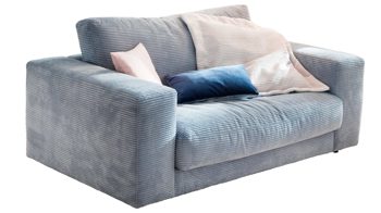 Der 2-Sitzer medium aus dem Polsterprogramm SOFAkultur Seventies ist mit hellblauem Cord bezogen und mit schwarzen Kunststoff-Gleitfüßen versehen. Er strahlt Modernität und Gemütlichkeit aus. Dank der schichtweise aufgebauten PUR-Schaumpolsterung auf einer gut stützenden Wellenunterfederung bietet das Sofa hohen Sitzkomfort. Dazu tragen auch die losen Rückenkissen mit Inlett bei.