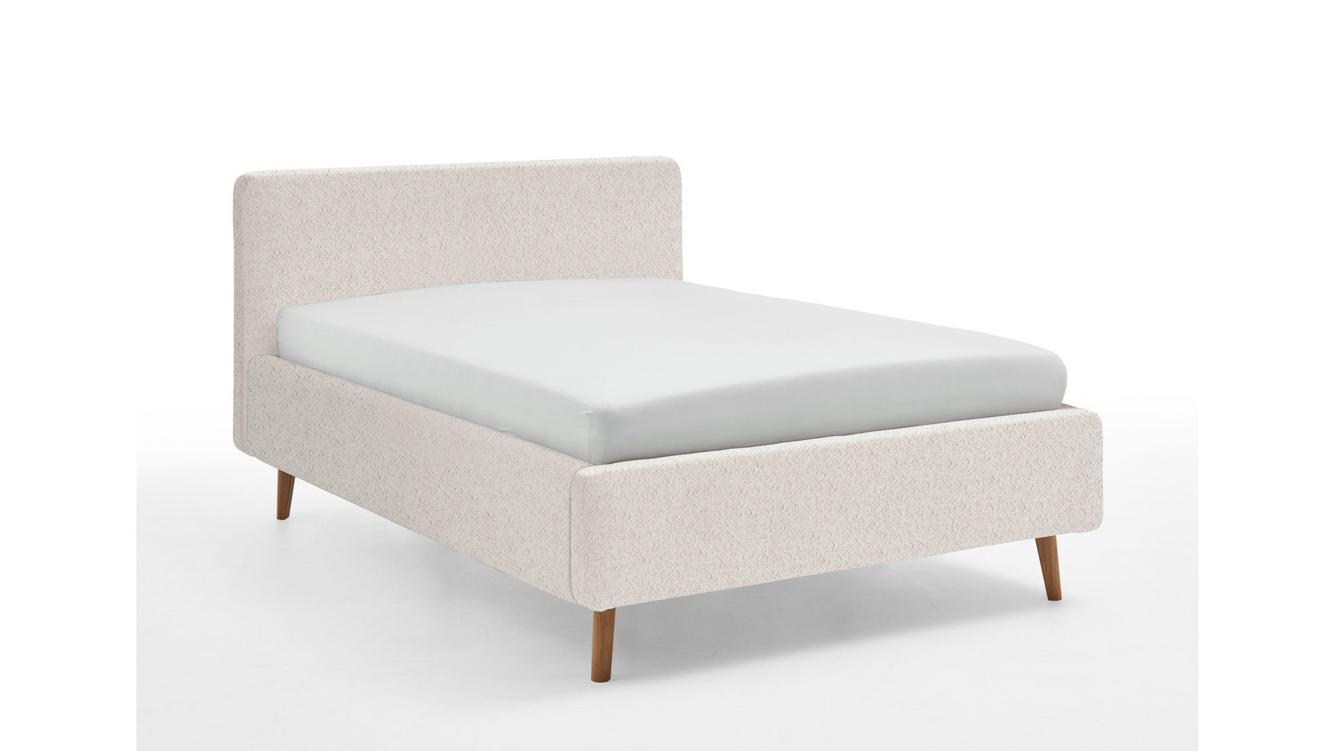 Das Polsterbettgestell Mattis begeistert durch die elegante Optik sowie die hervorragende Material- und Verarbeitungsqualität. Es kombiniert einen weißen Boucle-Bezug mit eichefarbenen Holzfüßen. Sowohl die Bettseiten als auch das Polsterkopfteil sind glatt bezogen. Letzteres lädt Sie ein, sich anzulehnen, wenn Sie abends im Bett vor dem Schlafen noch fernsehen oder in einem Buch lesen.