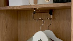 Der eintürige Garderobenschrank mit einer links oder rechts montierbaren Tür, ausziehbarer Kleiderstange, einem festen Boden und vier Holzböden bietet viel Platz für Jacken, Mäntel und Accessoires. Mit Maßen von ca. 60 x 202 x 39 cm (B/LxHxT) fügt sich der Schrank harmonisch in verschiedenste Raumsituationen ein.