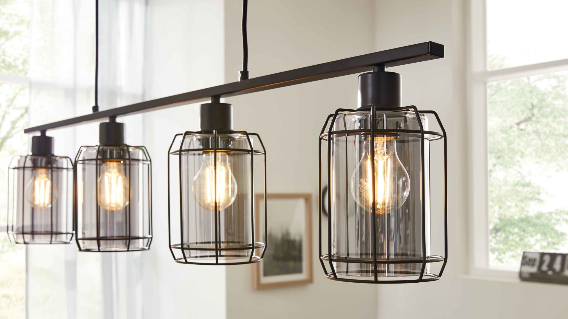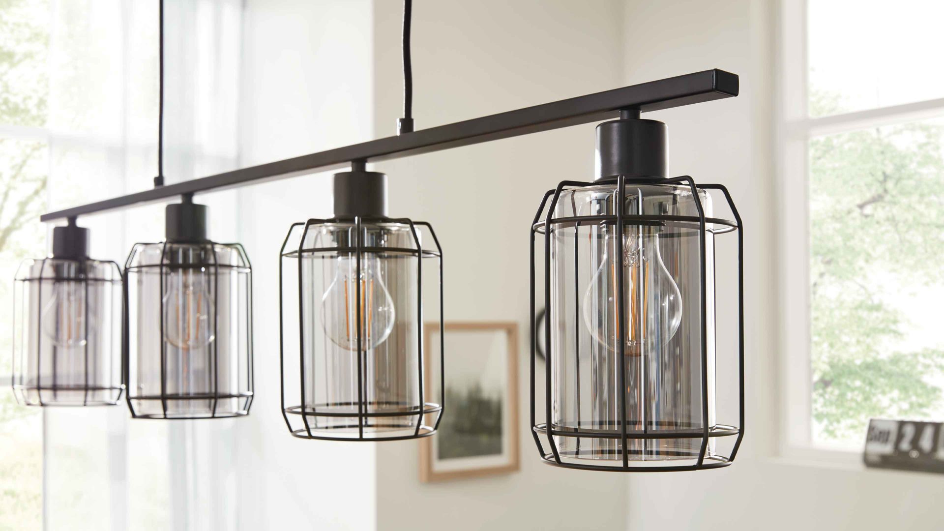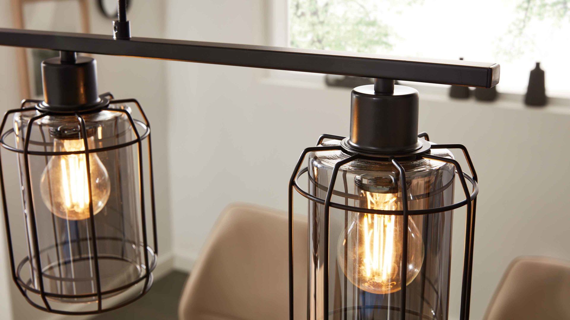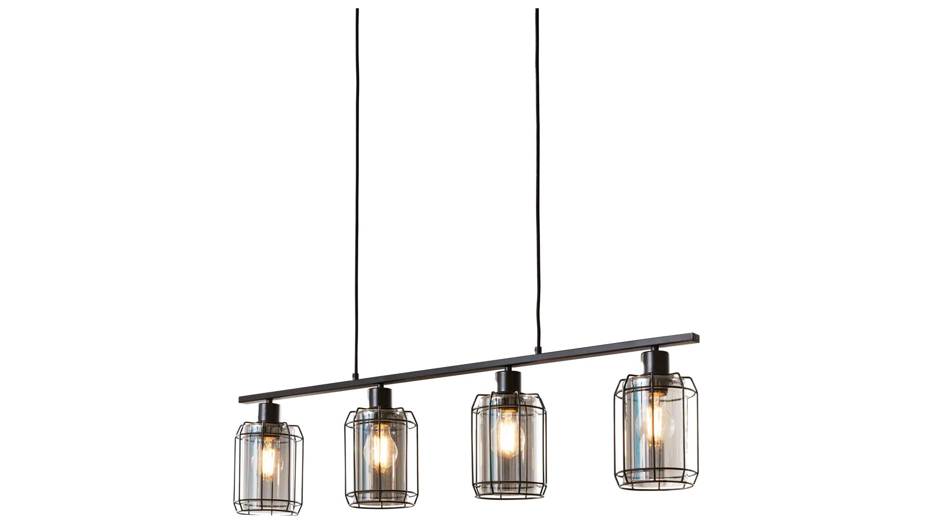 Mit ihrer Basis aus klassisch mattschwarzem Metall und den vier Lampenschirmen aus rauchfarbenem Glas vereint die Hängeleuchte aus der Interliving Leuchten Serie 9331 moderne Eleganz mit dem unverwechselbaren Charme des beliebten Industriestils. Das harmonische Zusammenspiel aus kühlem Metall und getöntem Glas sorgt für ein stilvolles Ambiente – perfekt für dein Esszimmer oder deine Küche.