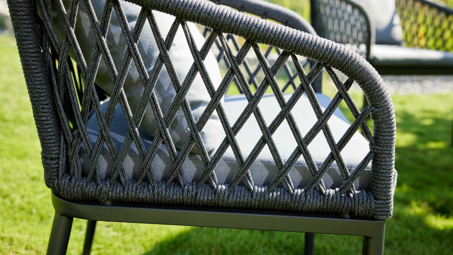 Der Sessel überzeugt durch sein graues Kordelgeflecht in dekorativer Rautenoptik, das gemeinsam mit dem anthrazitfarben pulverbeschichteten Aluminiumgestell einen modernen und luftigen Look erzeugt. Das verwendete Kordelmaterial besteht zu 100 % aus pflegeleichtem Polyester – witterungsbeständig, strapazierfähig und formstabil.