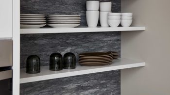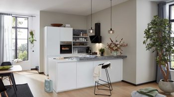 Die WERT KÜCHE® Ulrika präsentiert sich mit matten kristallweißen Fronten, Arbeitsplatten, Regalen und Sockelleisten für eine puristisch-elegante Ausstrahlung. Einen gelungenen Akzent setzt die calancagraue Tresenplatte. Schlichte Griffmulden runden das moderne Design stilvoll ab.