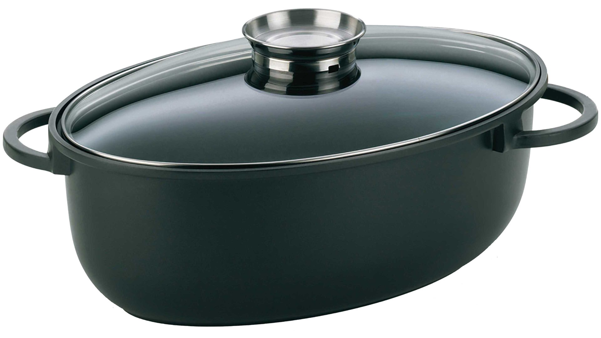 Der ovale Bräter aus der Serie Kerros von kela. Dieser Aroma Bräter ist für Feinschmecker wie gemacht. Der Glasdeckel ist mit einem Aromaknopf versehen, der - beispielsweise mit Wein befüllt - durch langsames Abtropfen das Aroma des Bratguts verfeinert. Der Bräter ist aus schwarzem Aluguss und hat eine GREBLON®-Stonehenge-Beschichtung: Der Bräter ist durch ein 3-Schicht-System keramisch verstärkt, wodurch sich der Bräter durch sehr gute Abriebbeständigkeit und Antihaftwirkung auszeichnet.