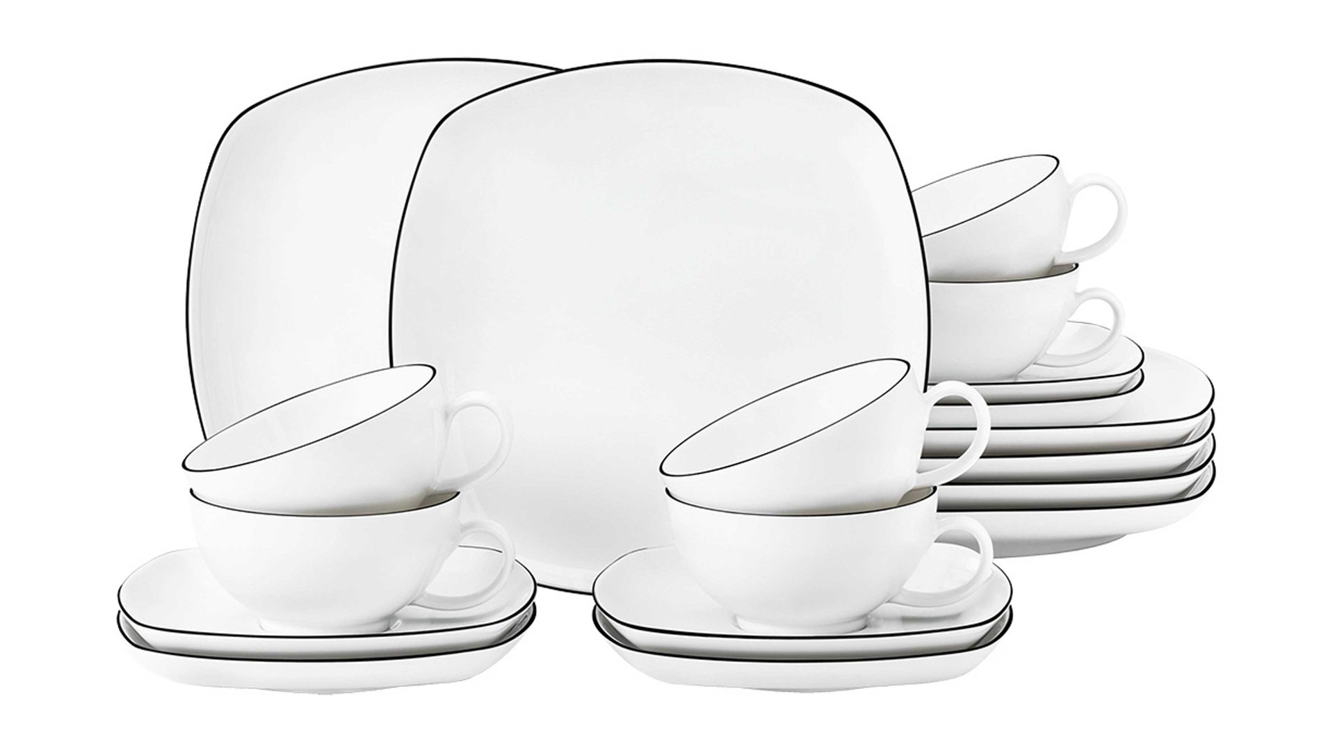 Alle Teller und Tassen sind aus hochwertigem, weißem Porzellan hergestellt. Dessen stilvolle Optik sorgt in Kombination mit der feinen schwarzen Linie im Bereich des Teller- beziehungsweise Tassenrands für eine durch und durch elegante Erscheinung, die den Esstisch ziert.