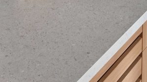 Arbeitsplatten in weißer Terrazzo-Nachbildung setzen einen stilvollen Akzent und unterstreichen das hochwertige Gesamtbild. Die Kombination aus klaren Linien und natürlichen Details schafft eine wohnliche Atmosphäre mit zeitloser Eleganz.