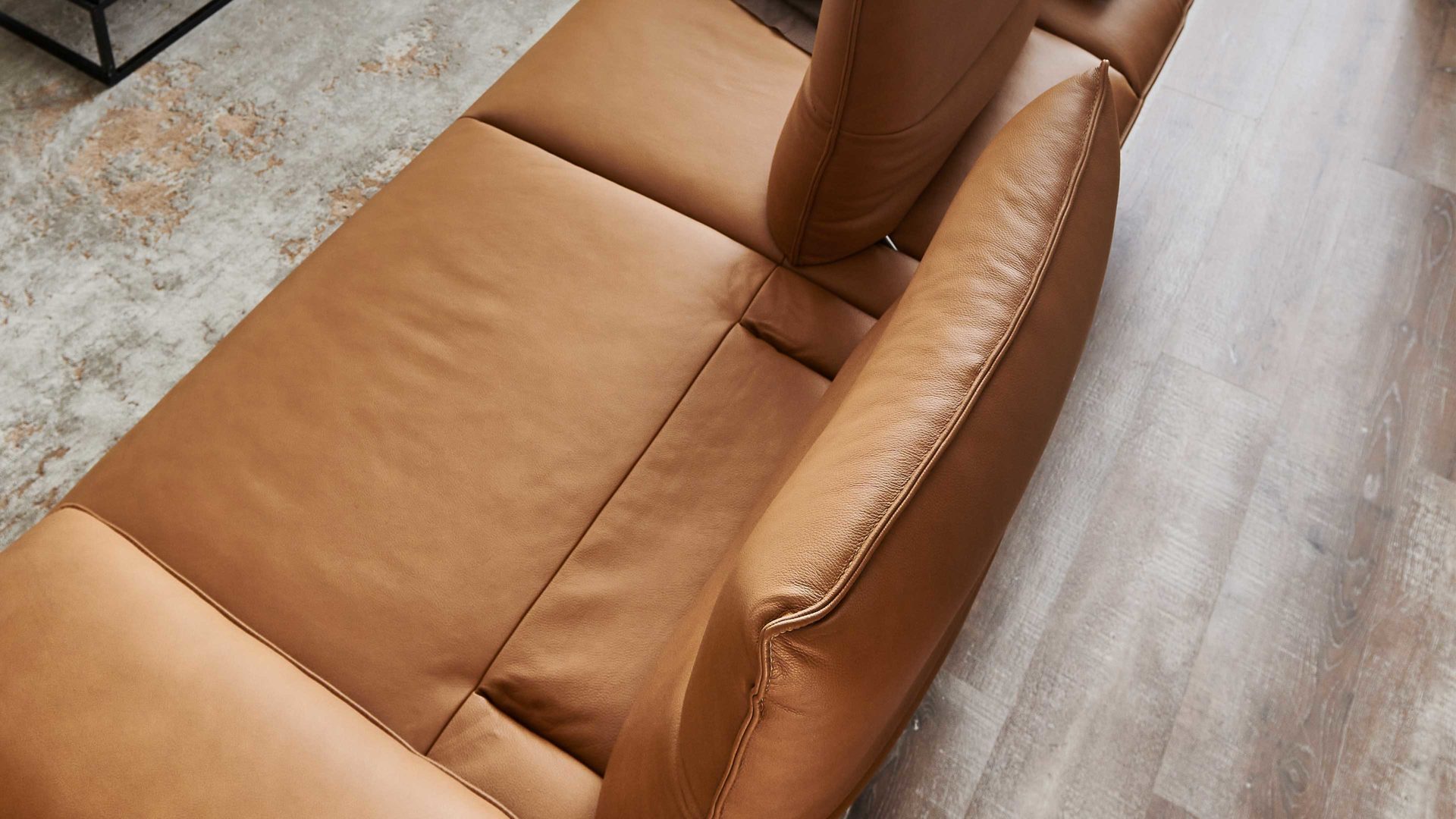 Besonders hervorzuheben sind die Funktionsrücken und die Sitztiefenverstellung des Sofas. Durch die zweifach verstellbare Rückenlehne mit eingearbeiteten Metallgelenken kann die Sitztiefe um bis zu 29 cm vergrößert werden. Dadurch erreicht das Ledersofa eine Gesamttiefe von ca. 113 cm. Durch das Umklappen der Rückenlehne nach hinten verringert sich die Gesamthöhe um bis zu 30 cm, während sich die Gesamttiefe um weitere ca. 34 cm vergrößert.
