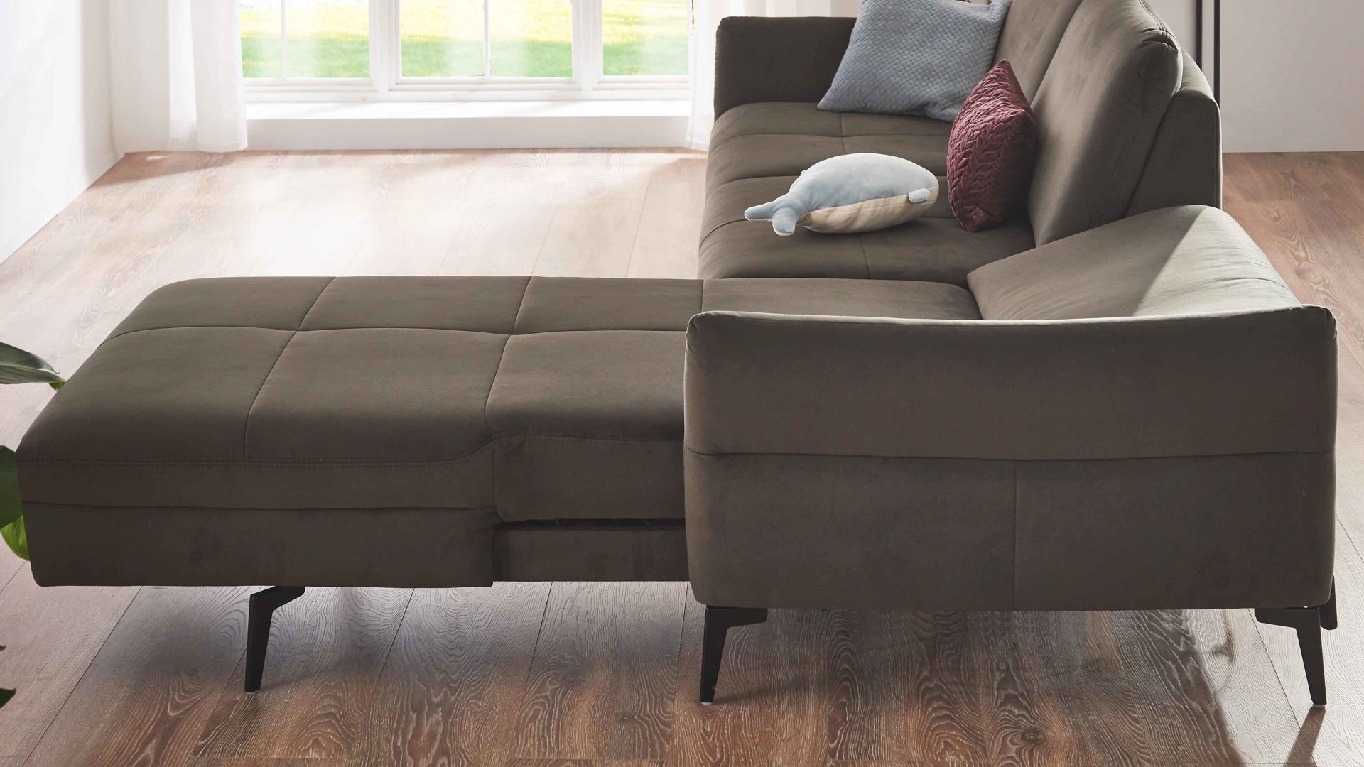 Zu den Highlights des Polsterprogramms gehören die grundsätzlich im Originalstoff bezogenen Rückseiten sowie die für Staubsaugerroboter ideale Bodenfreiheit. Die Serie ist Made in Europe und mit dem Goldenen M ausgezeichnet.