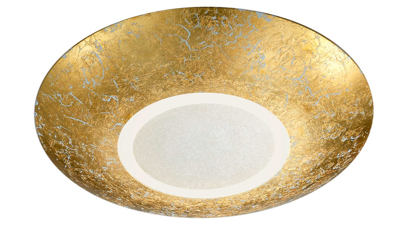 Die runde TRIO LED-Deckenleuchte Chiros ist aus goldfarbenem Metall hergestellt. Durch die edle, außergewöhnliche Kombination der Form, des Materials und der Farbe mit der bewusst eingearbeiteten Gebrauchsspuren-Optik strahlt die Lampe antiken Retro-Charme aus. Besonders fantasievolle Betrachter erinnert die Leuchte möglicherweise auch an einen faszinierenden Weltall-Planeten für zuhause.