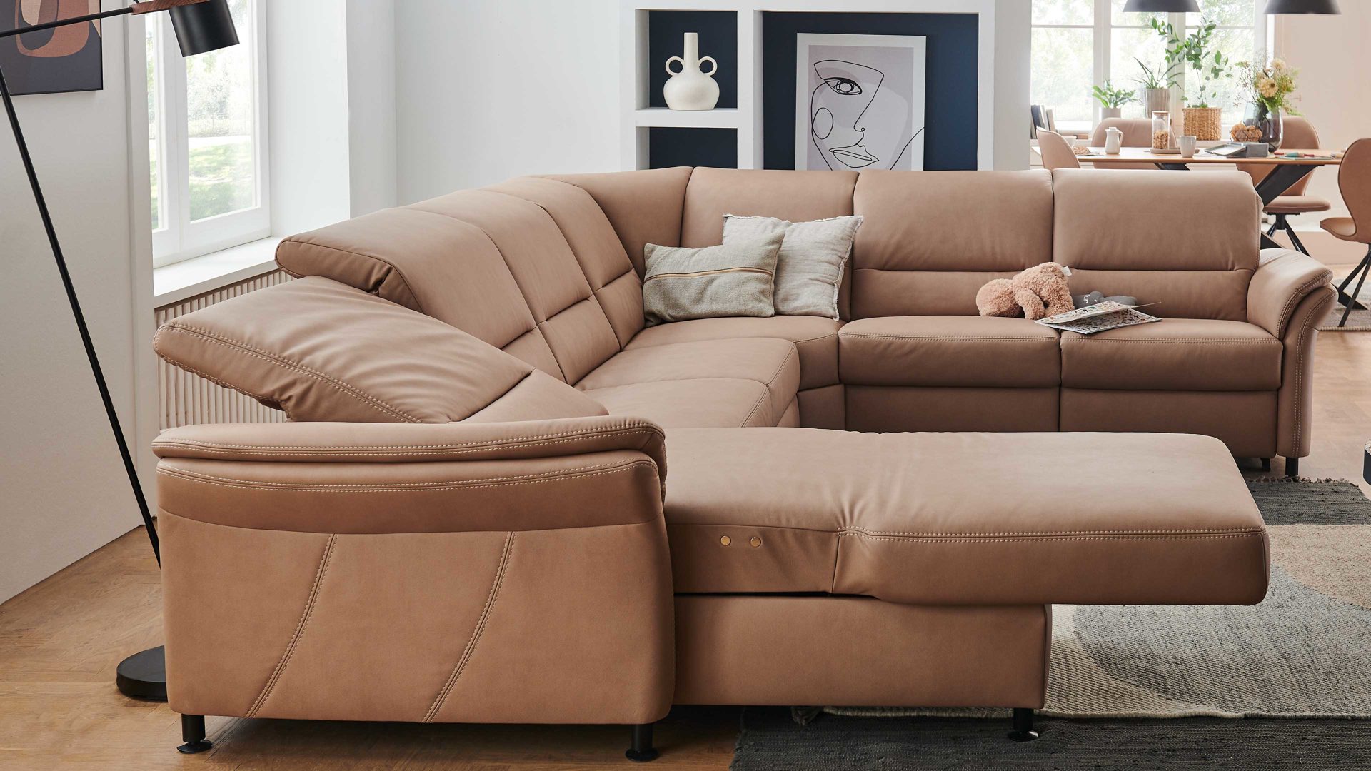 • Die Abbildung zeigt ein Wohnbeispiel, welches auch Dekoration sowie separat erhältliches Zubehör enthält. Im Lieferumfang enthalten ist eine motorische Relaxfunktion ohne Kopfteilverstellung.