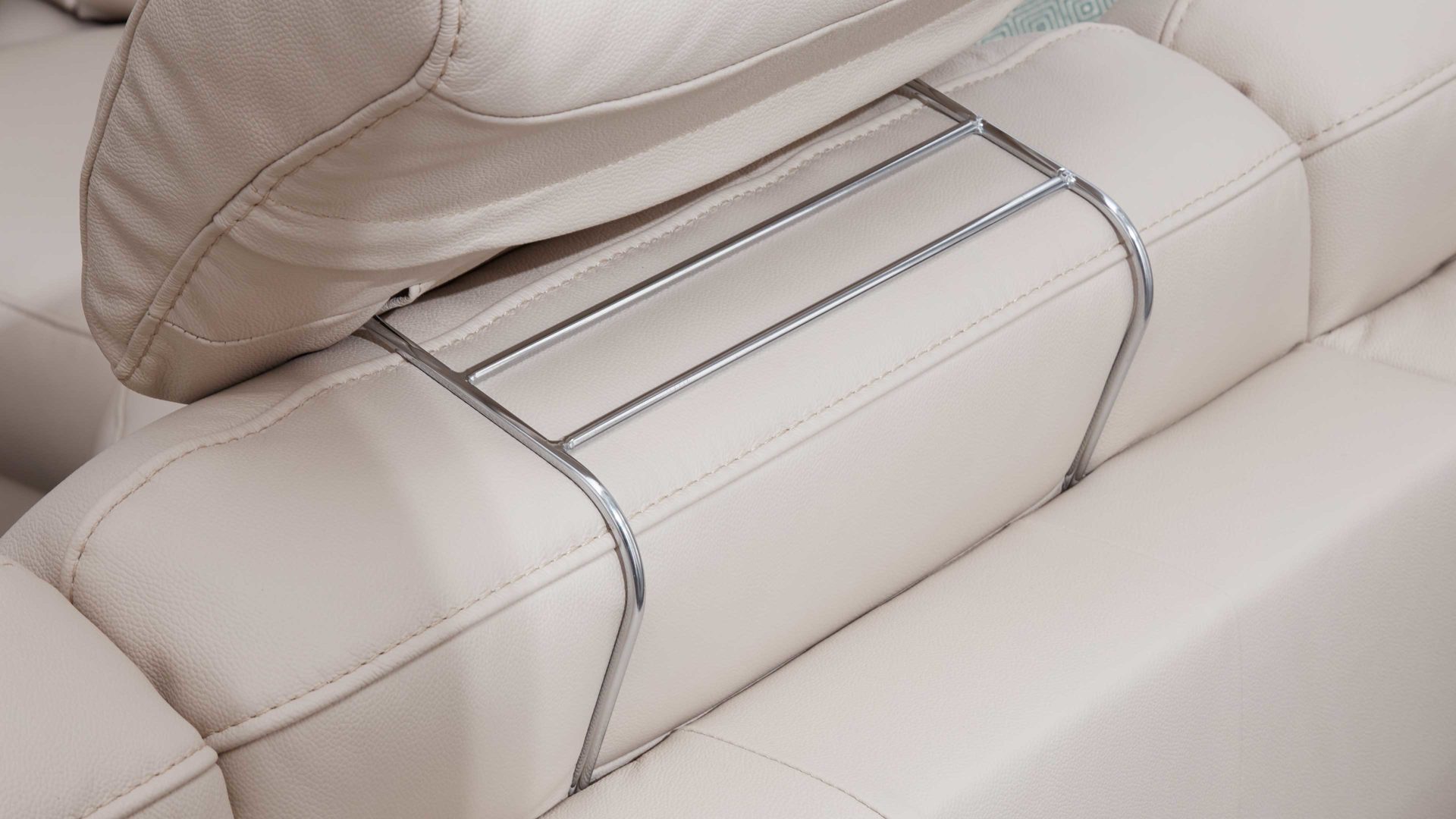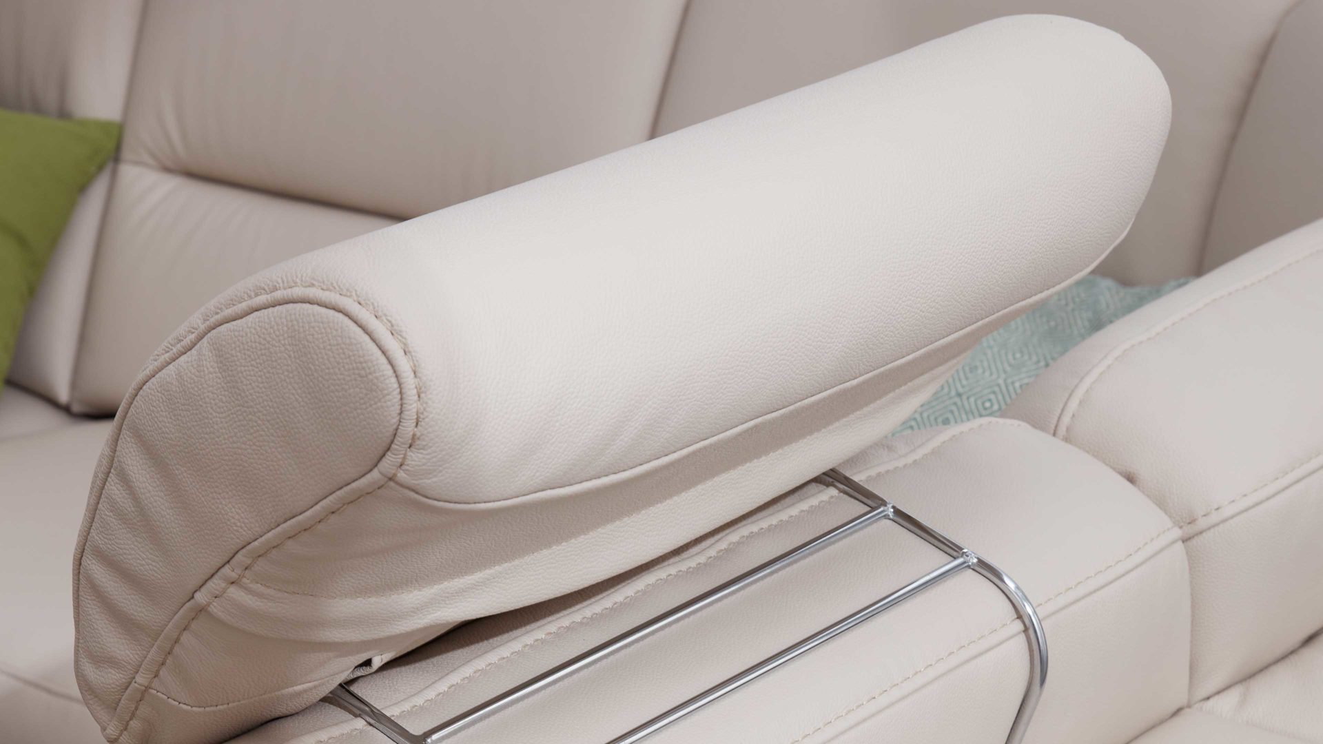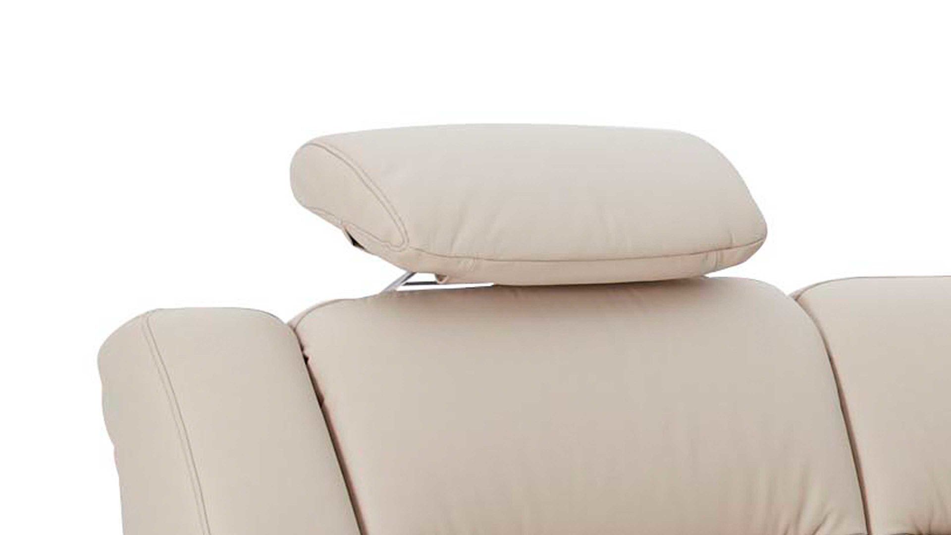 Die komfortable Kopfstütze 93X aus der Modulmaster Serie 1104 präsentiert sich in einem marmorfarbenen LongLife-Lederbezug, der Eleganz und Gemütlichkeit ausstrahlt. Sie passt zu den Sofas, die ebenfalls mit dem pigmentierten glatten Rindsleder samt markantem Narbenbild bezogen sind.